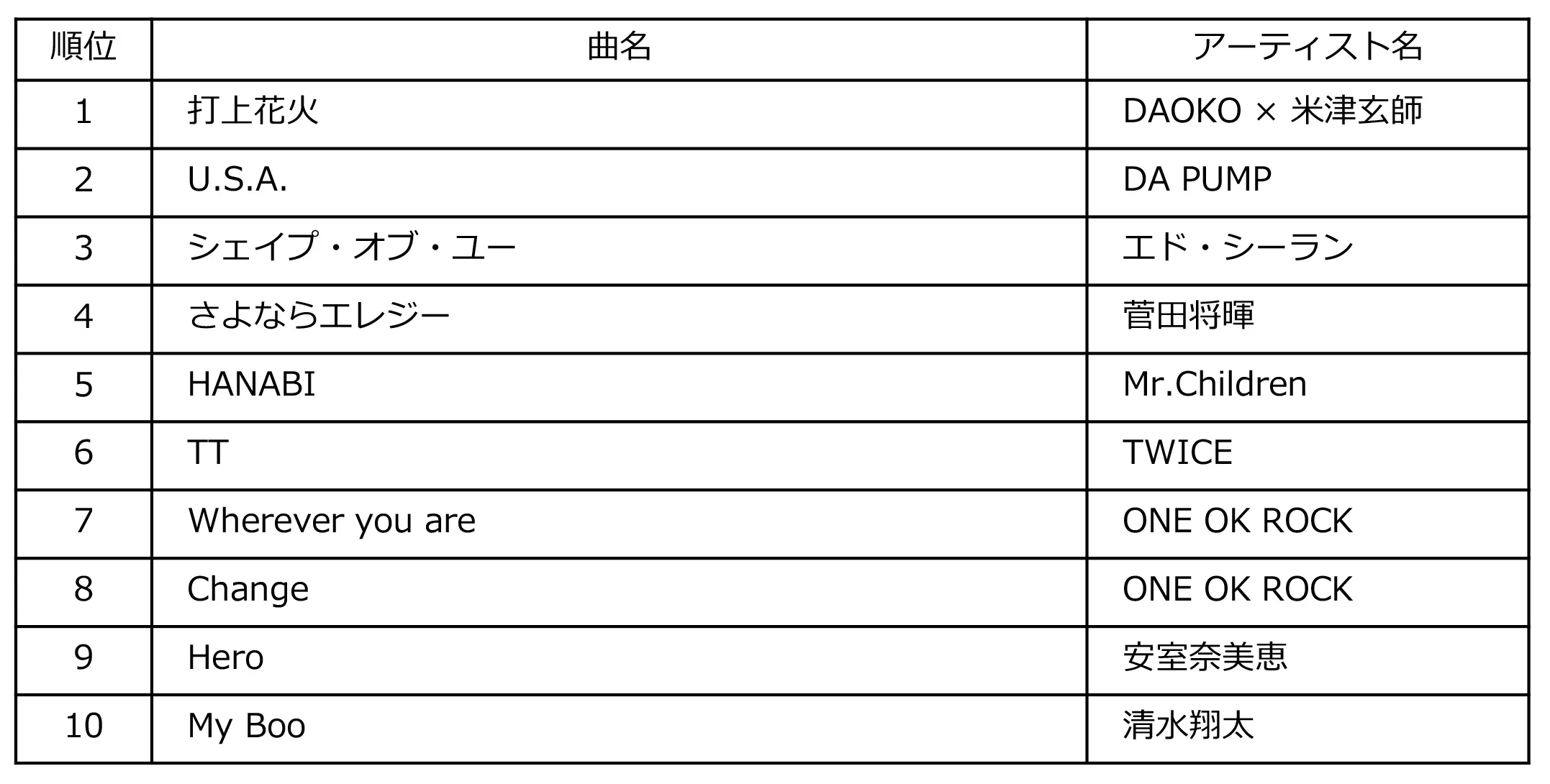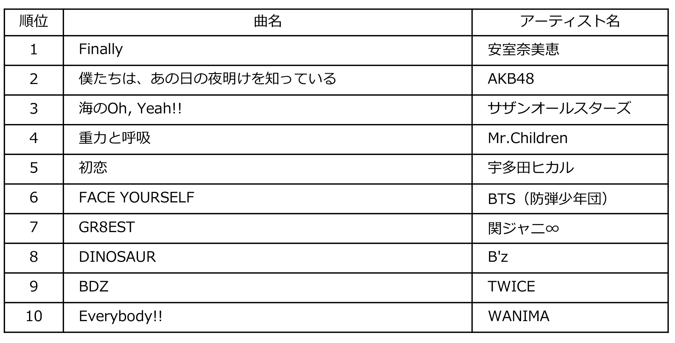 全国推定売上枚数、ダウンロード回数、ラジオ放送回数、ルックアップ数、ツイート数、ストリーミング数、YouTubeおよびGYAO!の動画再生回数を合算した、米国でもBillboard音楽チャートの中心となる総合ソング・チャートの年間1位