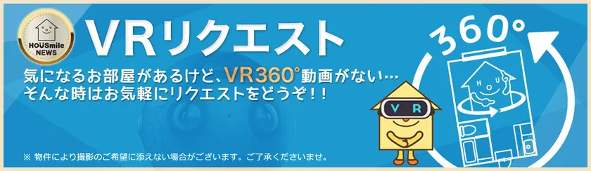 ハウスマイルの人気サービス、賃貸物件をVR360度動画で内見できる「バーチャル内見」をご利用いただいたお客様より、「物件の周囲などもVRで確認したい」というご要望が有りました。この声をきっかけに、スタッフの「出来る限りのリクエストにお応えしたい」という熱意から、ハウスマイルの新サービス『VRリクエスト』を開始することになりました。