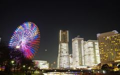 付近には、遊園地のよこはまコスモワールドやカップヌードルミュージアム横浜があります。ここでは、迫力の観覧車とともに、横浜ランドマークタワーからクイーンズスクエア横浜を中心にしたライトアップ、お天気が良いと月も映り込みます。人混みもそこまで多くなく、撮影場所として最適です。