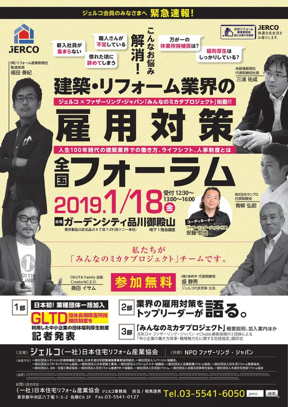一般社団法人日本住宅リフォーム産業協会(略称:ジェルコ)は、建設業及び特にリフォーム業界の働き方を見直し、働きやすい環境づくり・定着率を促進させることを目的とした「みんなのミカタ」プロジェクトをスタート。2018年12月から2019年1月にかけて全国でミニフォーラムを、2019年1月18日(金)には東京・品川で雇用対策フォーラムを開催します。