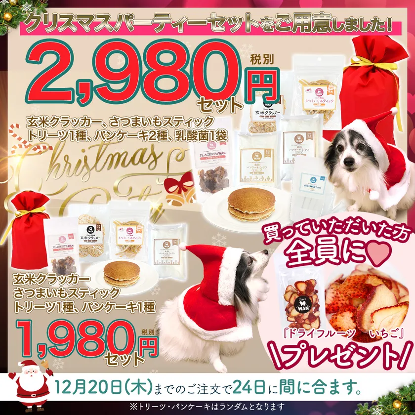 シェリーワンではクリスマスに向けて、人気商品の健康おやつシリーズ「PLACENTA WAN(プラセンタ ワン)」や手作りおやつシリーズ「犬用米粉パンケーキミックス」を詰め合わせたクリスマスギフトセットを販売しております。可愛らしくクリスマスの特別ラッピングで愛犬のクリスマスプレゼントや愛犬家のホームパーティーのお土産などにお楽しみ頂けます。さらに、クリスマスギフトセットご購入いただいた方、全員に「ドライフルーツ いちご」をプレゼントいたします!