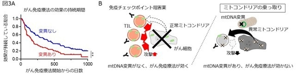 研究チームは、TILのミトコンドリアの損傷原因を解明するために、mtDNAの配列を調べたところ、約40%の症例でがん細胞と同じ変異が見つかりました(図1A)。そこで、がん細胞からTILへのミトコンドリアの移動を疑い、がん細胞のミトコンドリアを赤、TILのミトコンドリアを緑に色付けして観察したところ、がん細胞からTILにミトコンドリアが移動し、入れ替わるものがあることがわかりました(図1B)。その結果、がん細胞のmtDNA変異がTILにも現れるようになりました。その原因として、活性酸素(ROS)が関与していると考え、ROSを取り除く薬を使うと、ミトコンドリアの入れ替わりが抑えられました。また、変異したTILではエネルギーを作る機能が低下し、その働きも弱くなりました。T細胞のミトコンドリアが損傷したマウスでは、がん免疫療法が効きにくくなり、特にいったん免疫チェックポイント阻害薬で治療した後に、腫瘍が再びできやすくなることが示されました(図2)。さらに、腫瘍でmtDNA変異が見つかる患者さんでは、がん免疫療法の効果が長続きせず、生存率も悪化することがわかりました(図3A)。これらの結果から、がん細胞が異常なミトコンドリアをTILに送り込み乗っ取ってしまうことでTILの働きを妨げ、免疫システムから逃れようとしていることが明らかになり、このことががん免疫療法の効果を弱める一因となっていることがわかりました(図3B)。