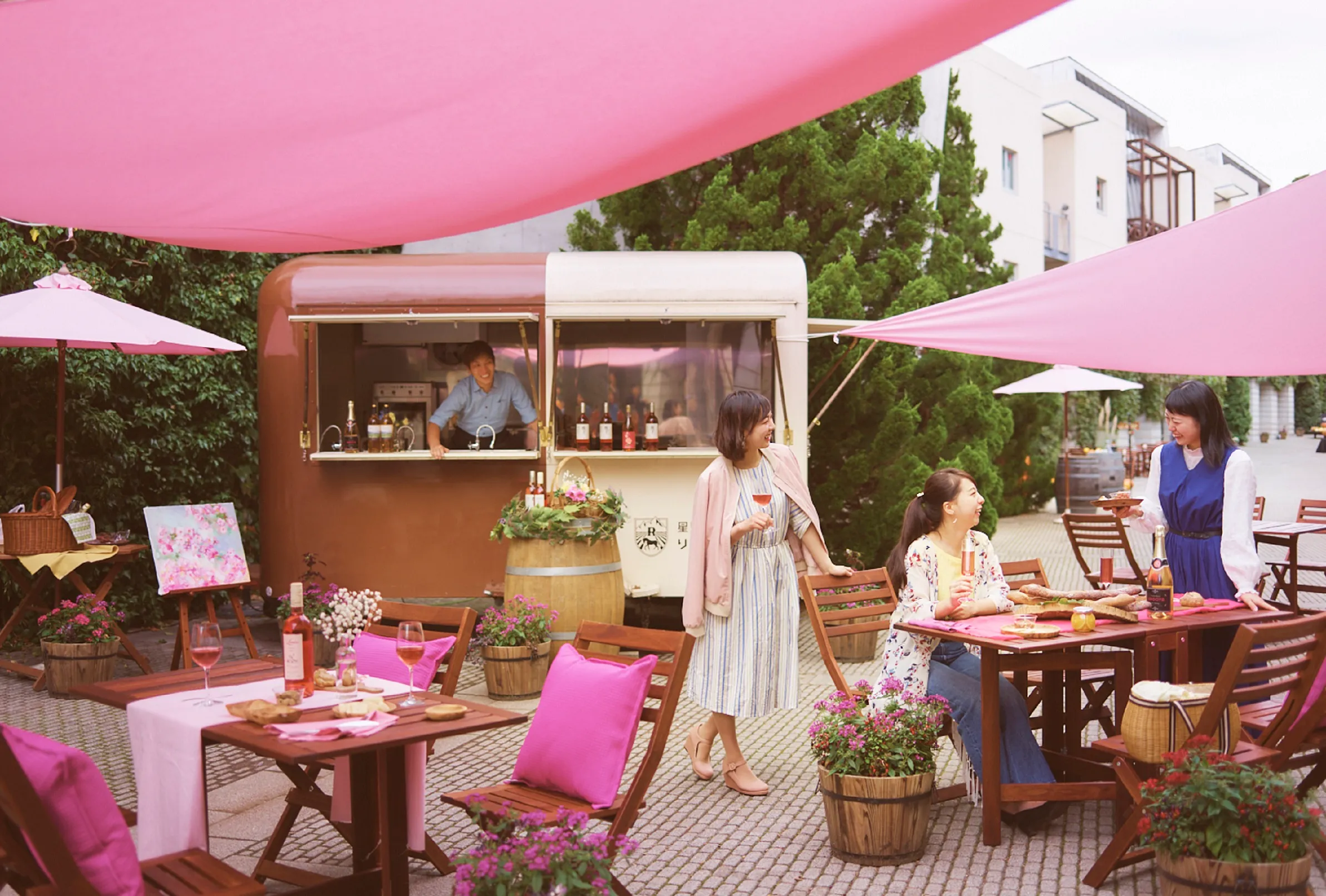 ロゼストリートの中央には、キッチンカーが登場し、3種類の山梨県・長野県のロゼワインや、フォトジェニックな「ロゼ色わたあめ」を販売します。心躍る装飾に彩られた華やかな街並みの中で、気軽にロゼワインを味わえます。
