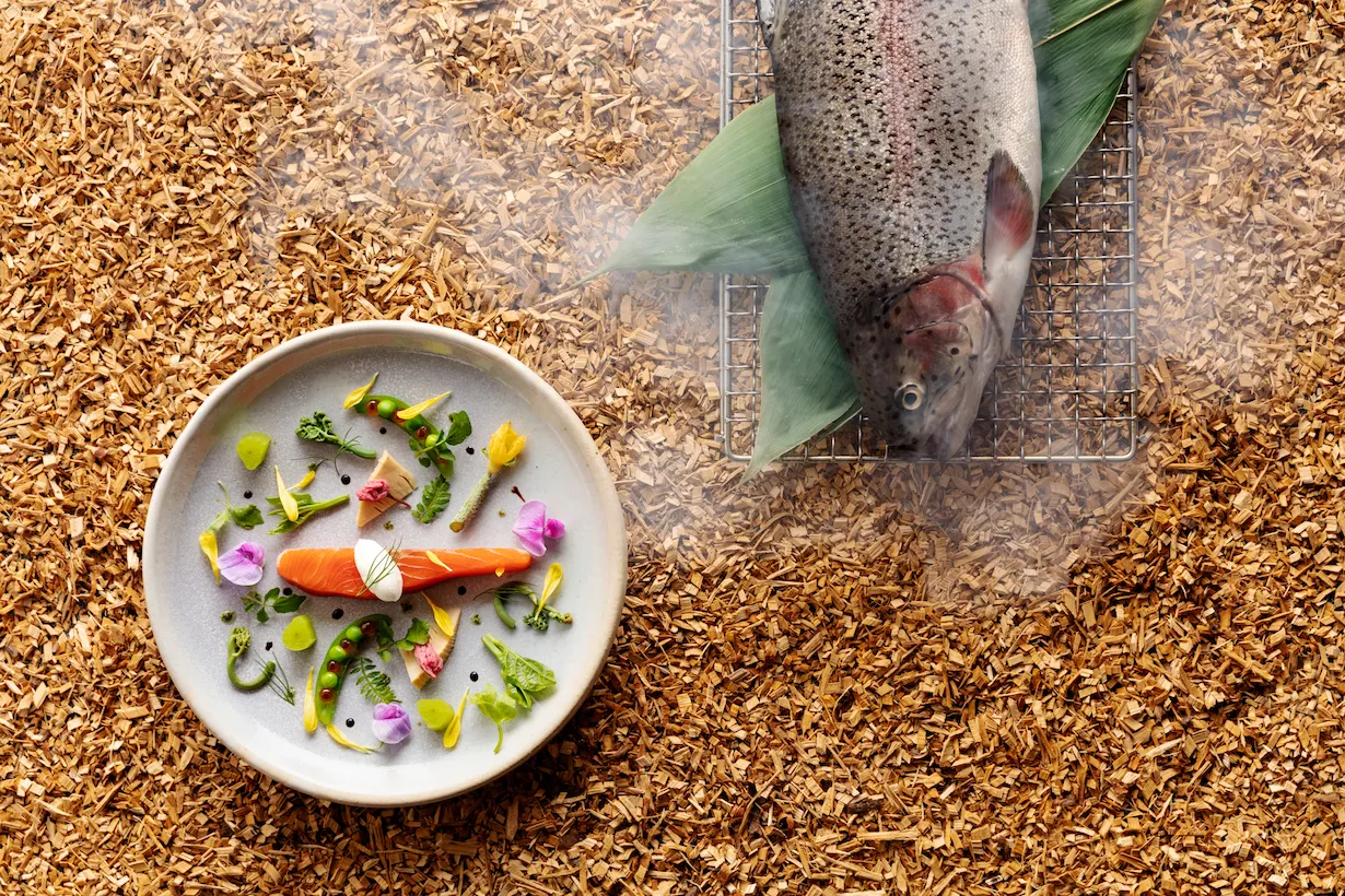 一例として、サラダは、桜鱒を燻製し、シンプルに山菜や春野菜と組み合わせます。燻製の香りと野菜の苦味を感じることができる一品です。またメイン料理は、筍で包み込んだ鹿肉を、山椒の塩釜の中に入れ、ダッチオーブンを使って焼き上げます。ほろ苦くも甘みのある筍と野趣あふれる鹿肉を組み合わせることで、肉の旨みがより際立ちます。また、塩釜として調理することで、山椒の力強い味わいを感じながら塩味も合わせて楽しむことができます。