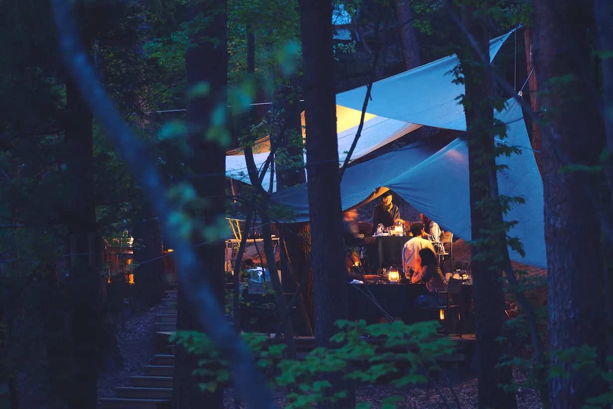 当ディナーは、アウトドアをラグジュアリーに感じる空間で食事を楽しんでほしいとの思いから、屋外ダイニング「フォレストキッチン」で提供します。フォレストキッチンは、標高約900mに位置し、高い木々に囲まれた森の中にあります。春の森は、緑が増え始め、気候も過ごしやすく快適です。料理は、ダッチオーブンを使い食材の火入れから盛りつけまでお客様自身が行います。おいしく仕上がる調理方法を熟知したグランピングマスターのサポートがあるため、アウトドア料理初心者でも安心です。