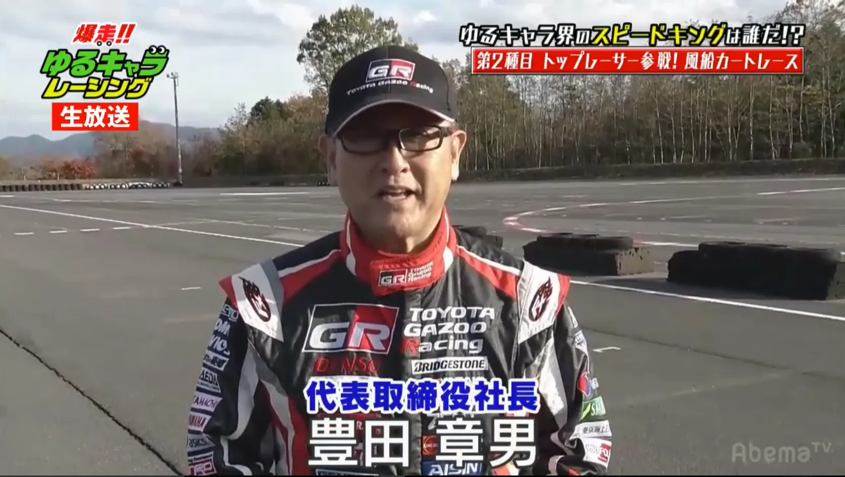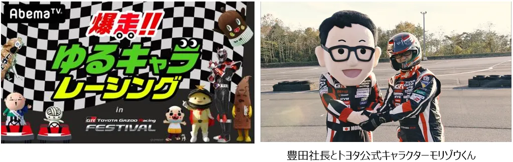豊田社長「AbemaTVをご覧のみなさん、こんにちは。ここ富士スピードウェイにて、GAZOO Racing FESTIVAL、今日はなんと、ゆるキャラVSリアルレーサーです。みなさんお楽しみいただいて。頑張ってください!」