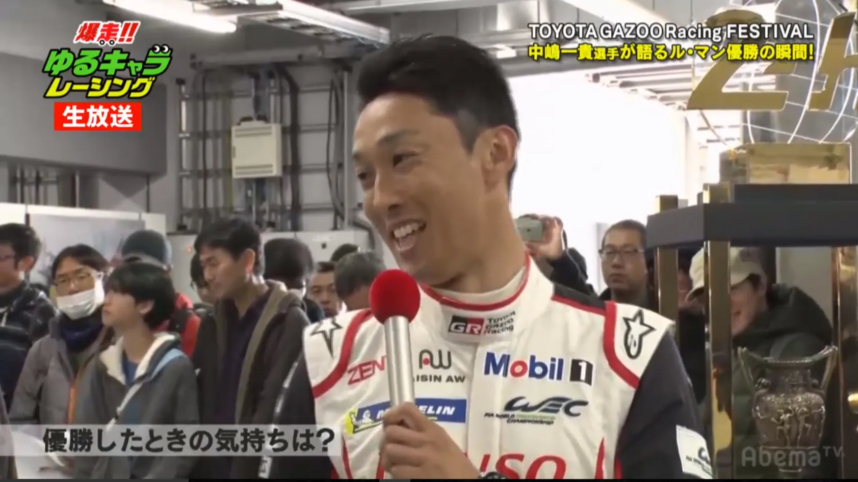 ゆるキャラレーシングの最終決戦を前に中継が入りました。TOYOTA GAZOO Racingの一員として、ル・マン 24時間レースで優勝をはたした中嶋一貴選手にずんのお二人がインタビューをしました。