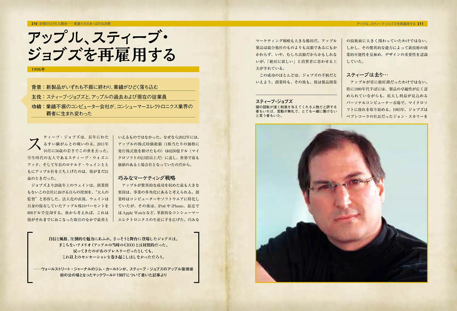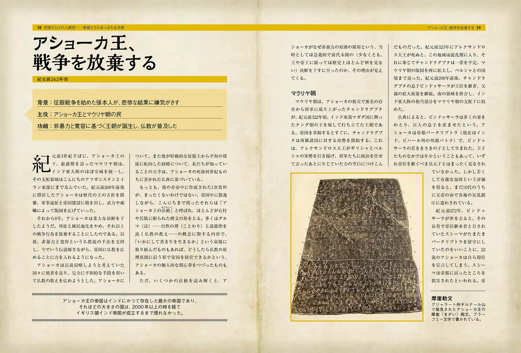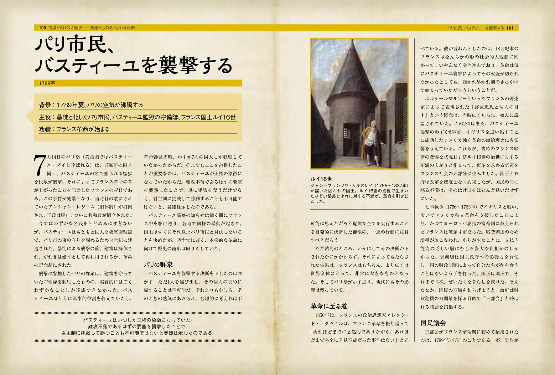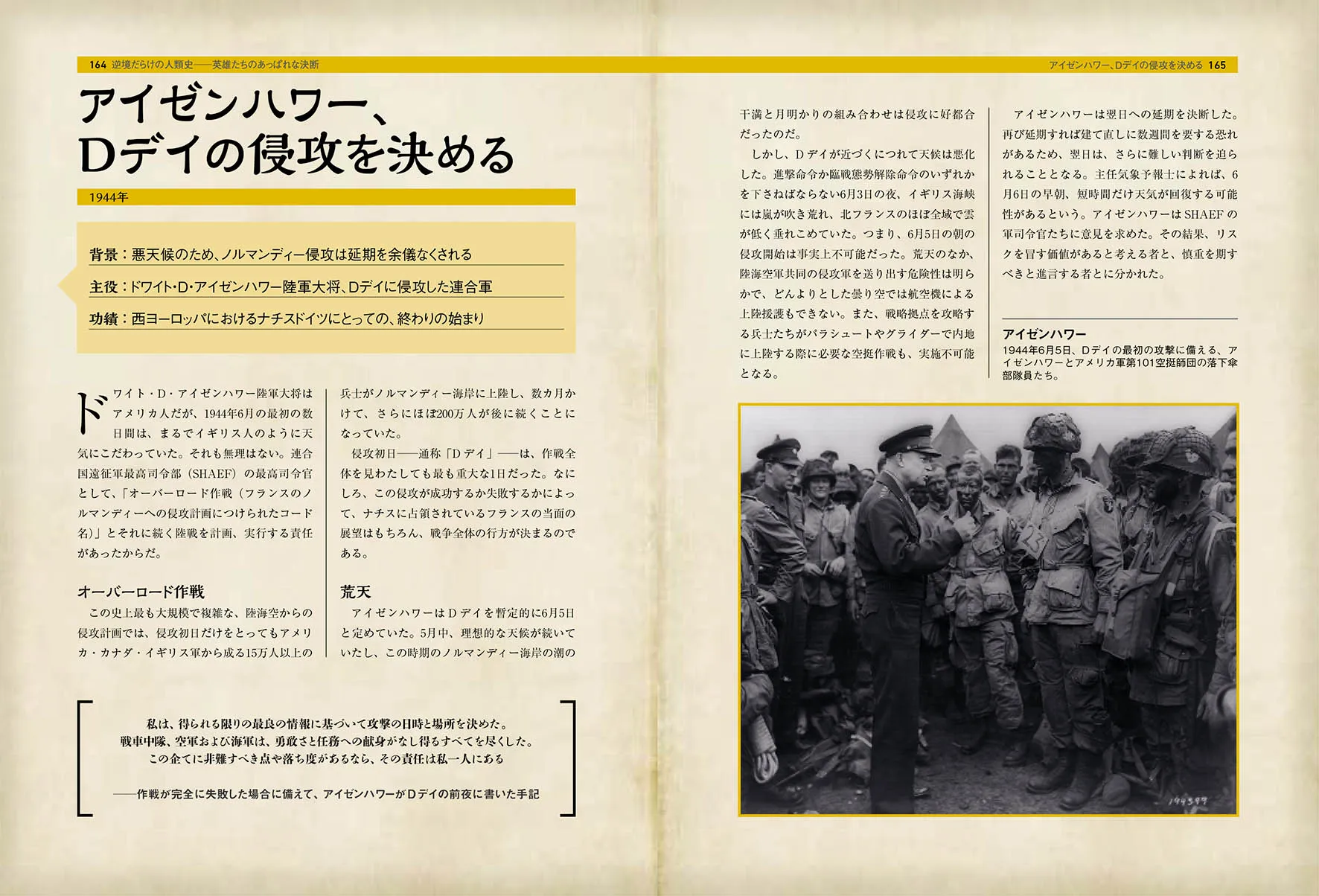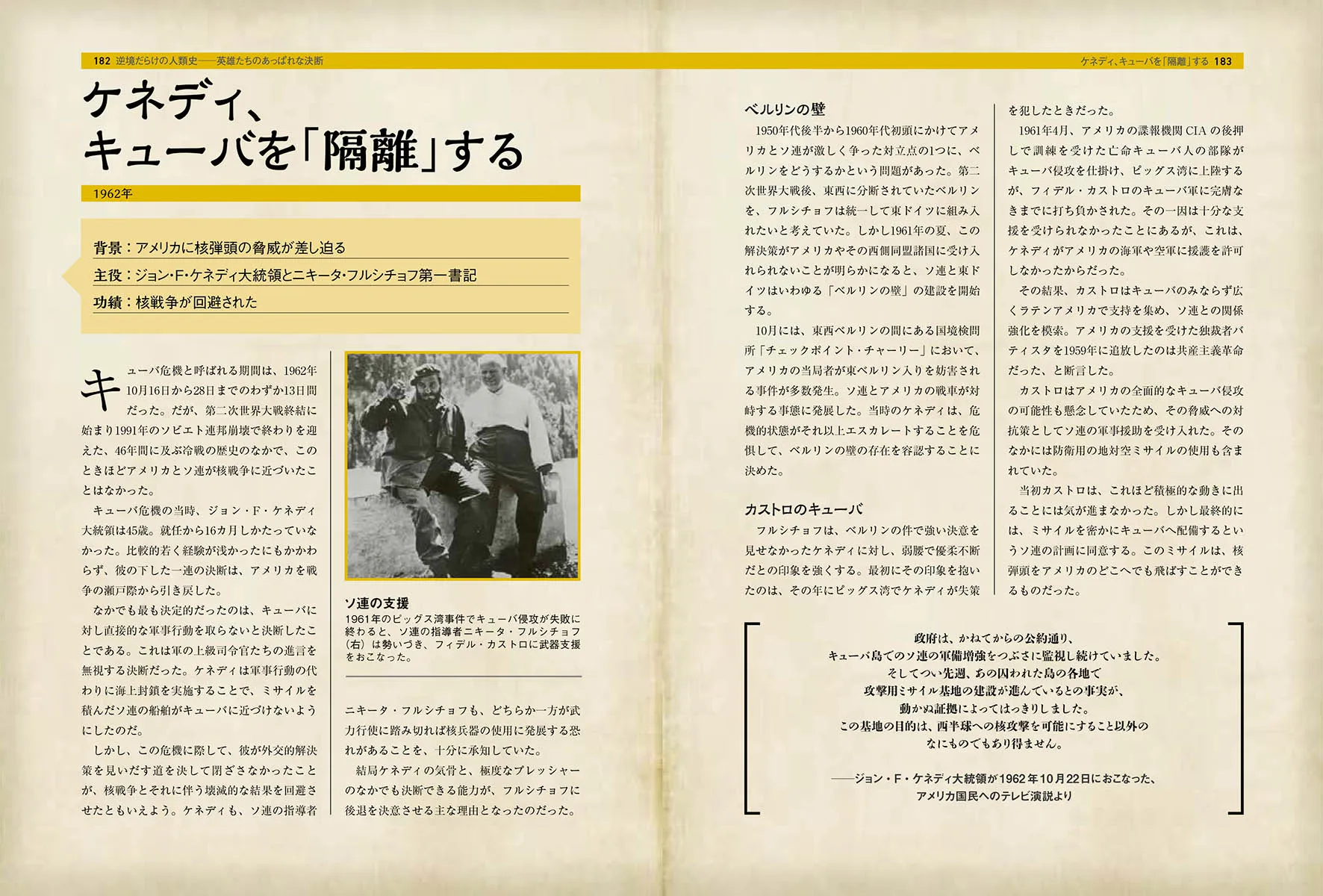 人類最古の決断から歴史を大きく動かした大英断までをカラーの図版、イラスト、写真を豊富に使用し紹介しています。太古から現代まで、教科書に載っている出来事の背景で下された、リーダーのあっぱれな決断、後に歴史を動かすことになる世界の片隅で起こった小さな決断の舞台裏を歴史的な事実に基づいて綴っています。