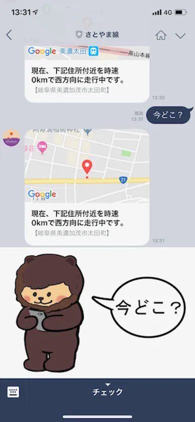各路線のLINEのアカウントをタップし、トーク画面で、“今どこ?”をタップすると、地図の上にバスの現在位置の表示と速度、進行方向が2~3秒で返ってきます。さらにトークをタップすると、バスの現在位置が詳細な地図で表示されます。