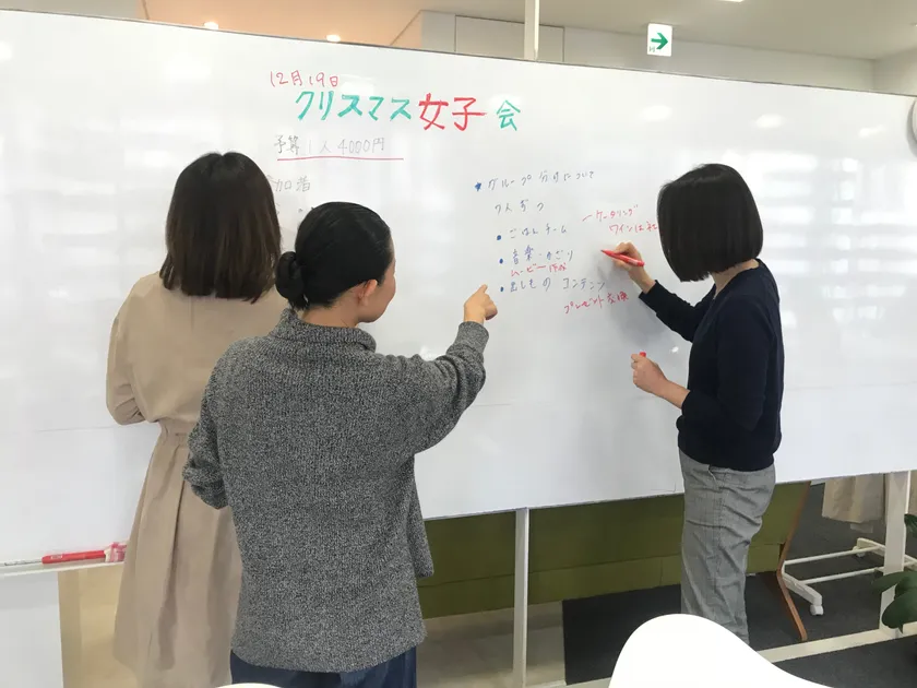 当社では全36人のスタッフのうち、女性が70%、内ママが約50%を占めています。子育てや子どものお迎えなどに柔軟に対応できるよう時短勤務や在宅勤務など働きやすい環境を整えていますが、業務終了後に開催される社内行事には参加しづらいという状況がありました。以前まではランチタイムに忘年会を行う部署もありましたが、時間が短いことやアルコールが飲めないなどの不満の声や課題を解決するため、全社開催の忘年会とは別に女性社員だけで忘年会を行うに至りました。