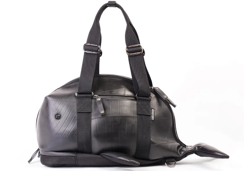 ディスカバリーチャンネルとのコラボモデル「ボストンリュックWhale」は、実際に使用し廃棄されたタイヤチューブをそのままの状態にて全面にリユースしています。「親子で楽しめる鞄」というコンセプトのもと、タイヤチューブの持つ質感や曲線を活かし、クジラの質感やフォルムを表現しをボストンバッグ・リュックサックになる2WAY仕様の鞄を開発いたしました。タイヤの持つ防水性に加えて全面に止水ファスナーを採用することにより突然の雨にもしっかりと内部を守り、さらに長さ調整可能なハンドルや収納可能なリュックショルダーや目の部分にイヤホンジャックを採用するなど、実用性をも兼ね備えています。また、全体のフォルムや尾びれの表現などは熟練した手作業が必要となり、国内職人の技術だからこそ実現したアート作品のような製品に仕上がっています。