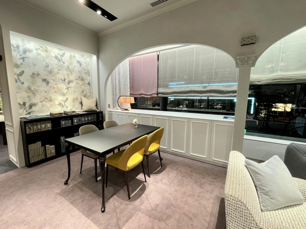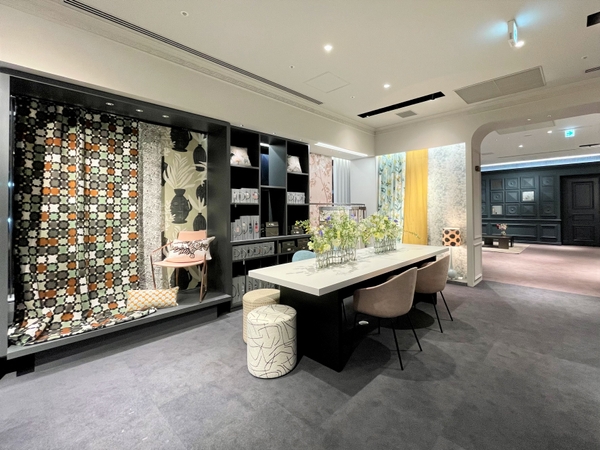 新ショールームでは、生地・壁紙・ラグ・照明・モールディングの幅広い商材をディスプレイ展示。