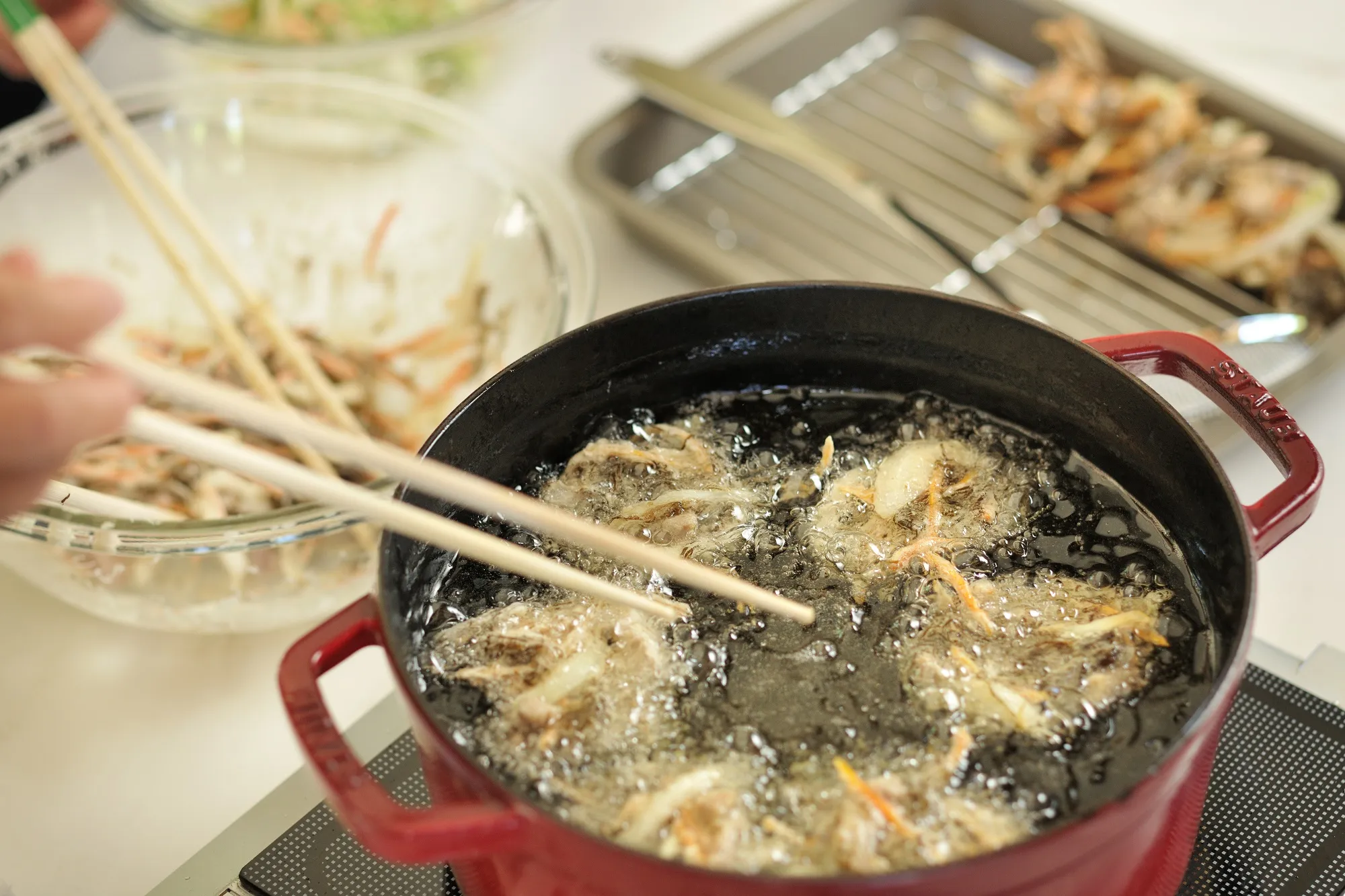 水を含むもずくには、水分量を少なくした天ぷら液を使い、小麦粉をまぶしてから揚げるなど、食材のことをよく知っているおばあだからこそしている調理方法や隠し味があります。そのため、外はサクサク、中はもっちりとした食感が楽しめる天ぷらや、磯の香りが豊かな卵焼きに仕上がります。おばあとのゆんたく(おしゃべり)を楽しみながら、島で採れる食材を美味しく料理して食べるという、竹富島の暮らしを体感することができます。