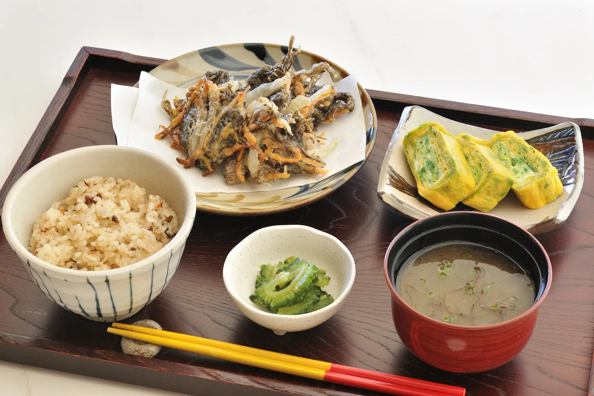 昼食(もずくの天ぷら、アーサーの卵焼き、ゴーヤの漬物、じゅーしー、