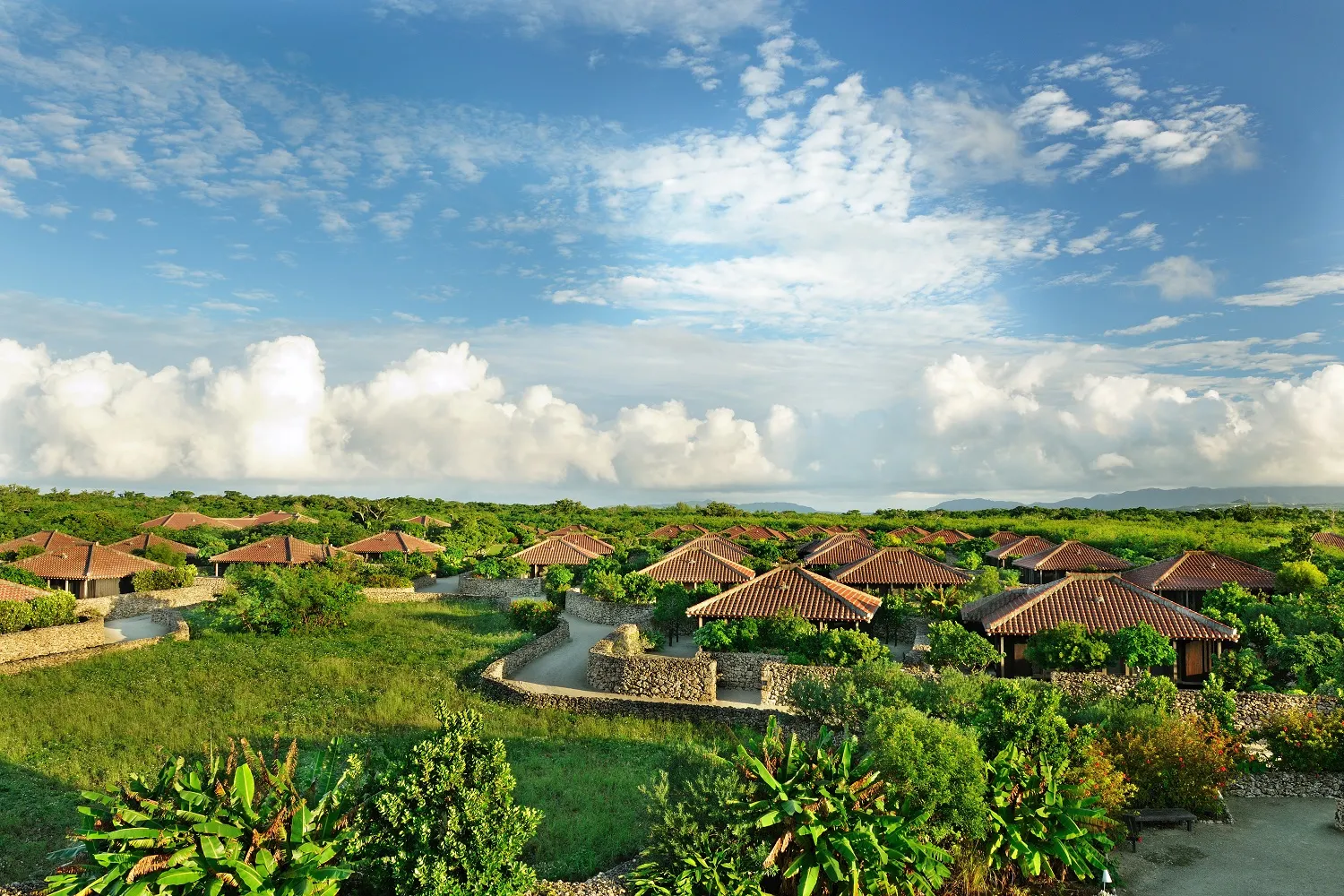 竹富島の東に位置する琉球赤瓦の集落「星のや竹富島」。約2万坪の敷地には、島内の家々と同じように「竹富島景観形成マニュアル」に従い、伝統を尊重して建てた戸建の客室、白砂の路地、プール、見晴台などがあり、小さな集落が構成されています。