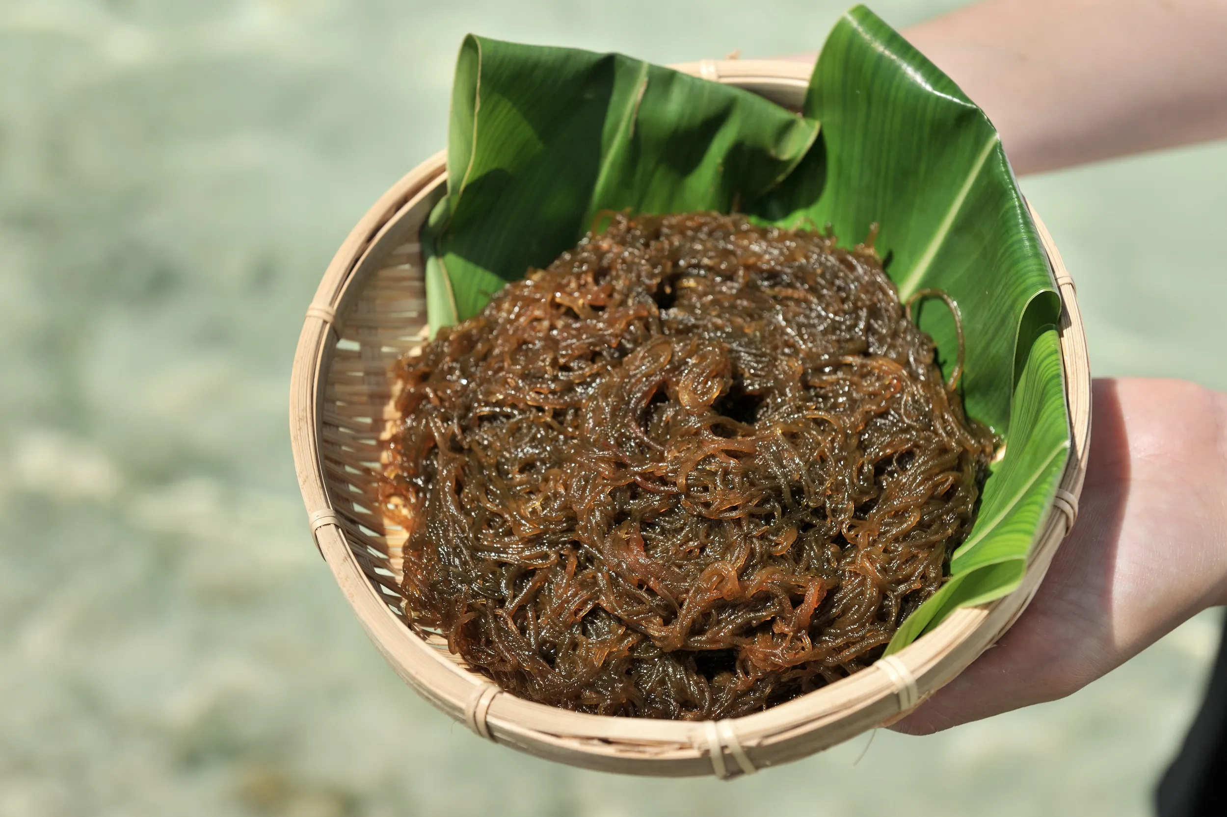 もずくは3月~4月の干潮の時にしか採れず、この時期は島民ももずく採りに向かいます。採ったもずくは塩蔵(えんぞう)され、一年を通して島の家庭の食卓に並びます。春は、塩蔵しない歯ごたえのいいもずくを楽しめる貴重な季節です。