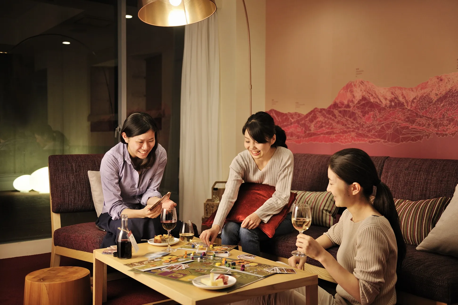 ボルドーカラーの客室で、賑やかにワイン女子会