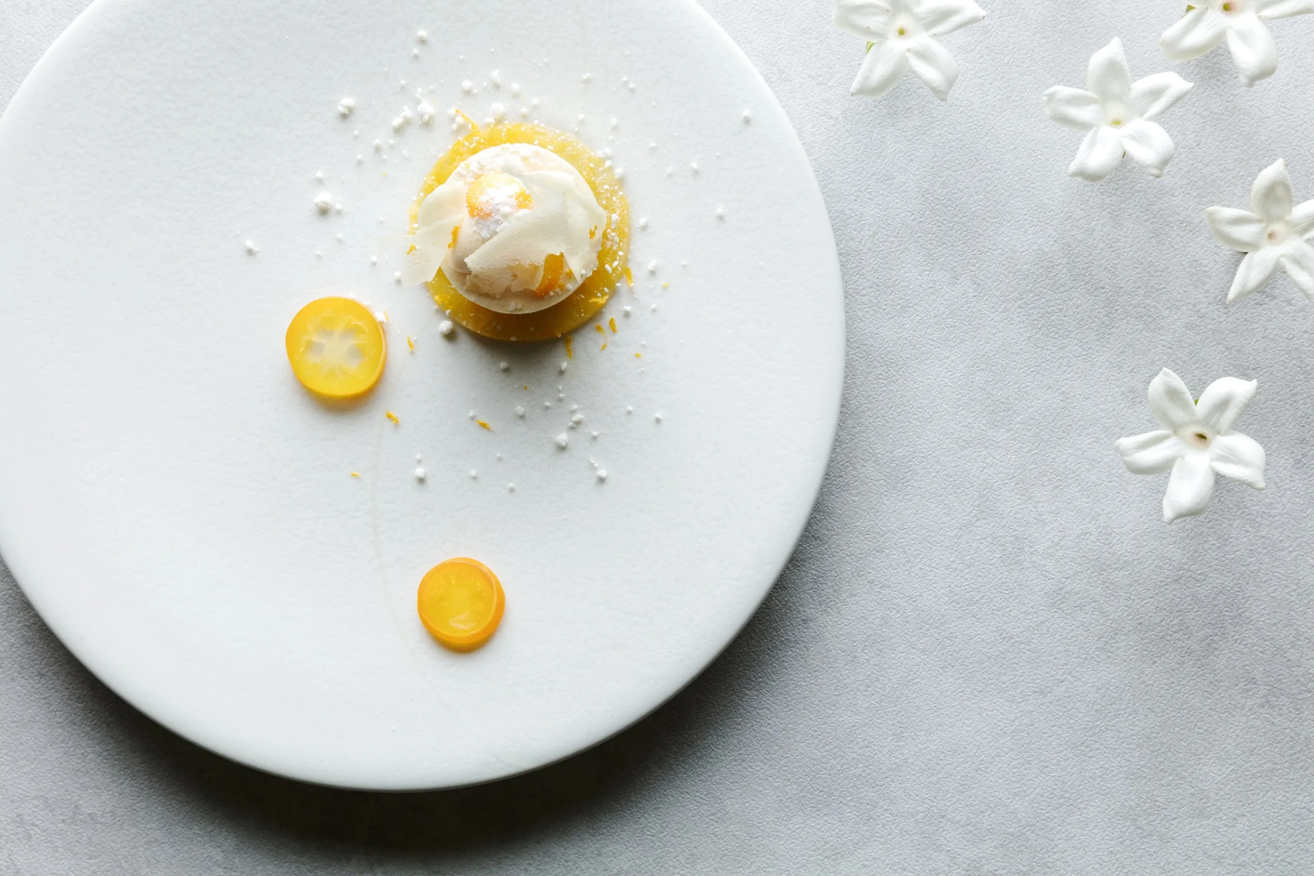 ホワイトチョコレートと、ハッサクのデザートです。さっぱりとした爽やかなハッサクのジュレの上に、なめらかなホワイトチョコレートのムースと、ジャスミンの香り付けをしたアイスを乗せています。ジャスミンの優雅な香りが、これから始まる幸せな時間を予感させます。