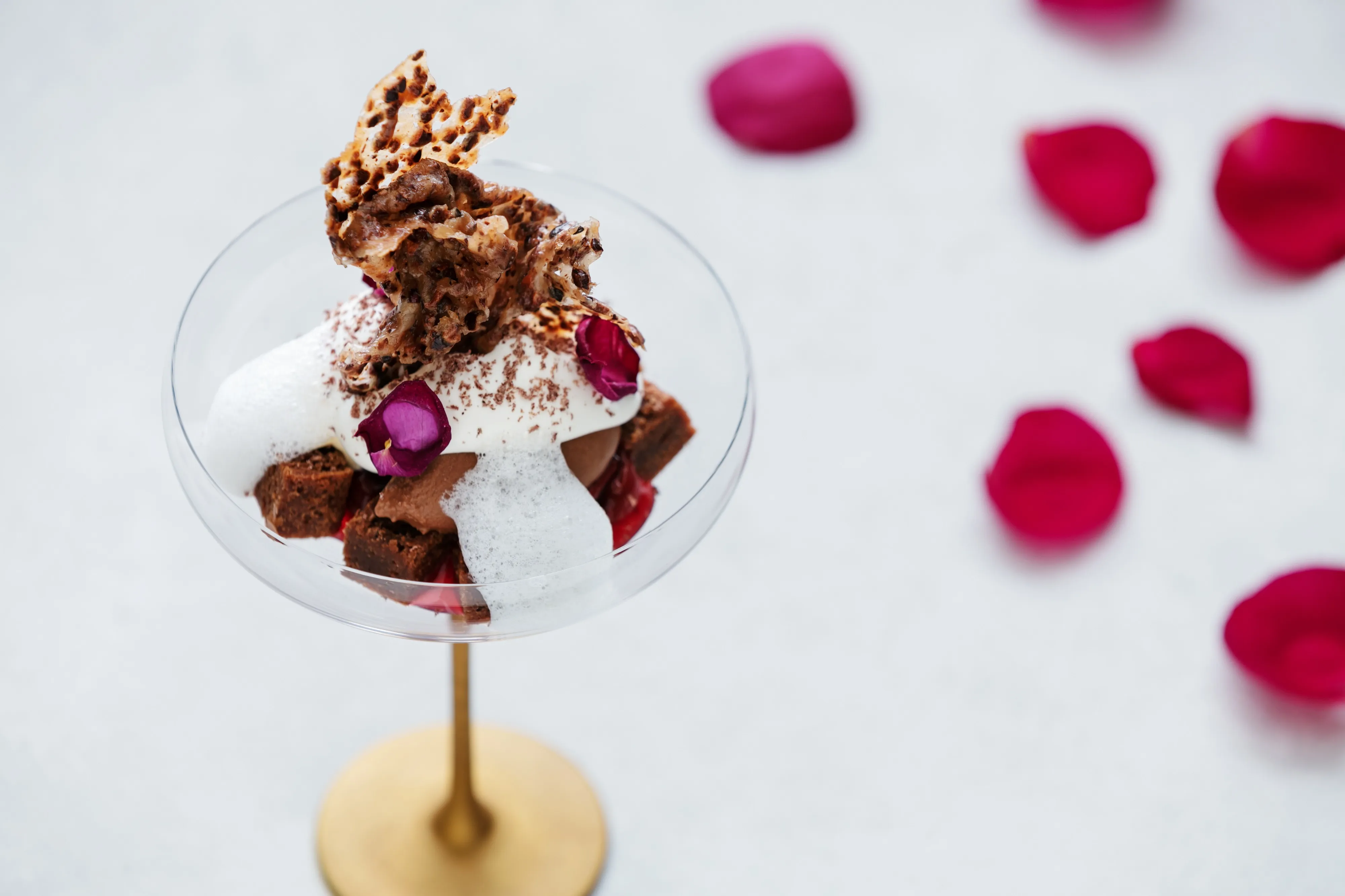 チェリーを使ったショコラケーキ、フォレノワールに見立てたパフェです。濃厚なショコラケーキ、ショコラのソルベ、カカオニブ(カカオ豆を砕いてチップ状にしたもの)で香り付けをしたアイス、サワーチェリーを、グラスに盛り付けています。バラの香りが漂う白いクリームとバラの花びらで仕上げた、見た目も香りも華やかなひと品です。