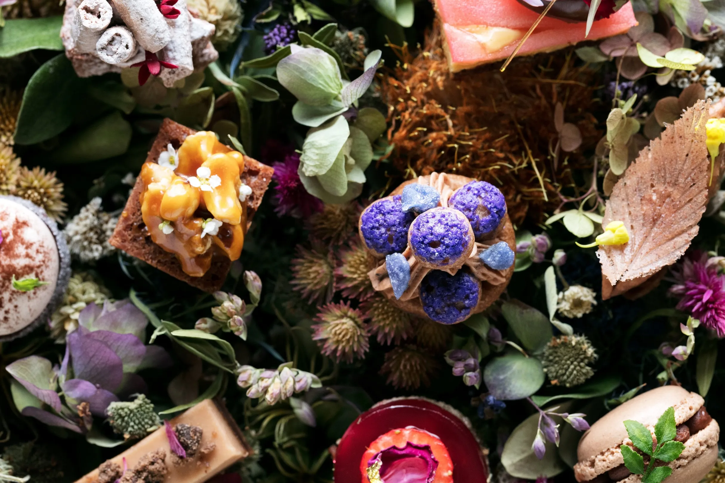 ショコラの花園の内容 イチゴのタルト、山椒を合わせたマカロン、チーズケーキ、ミルフイユ、スミレのサントノーレ(シュー菓子)、パート・ド・フリュイ(ゼリー菓子)、フロランタン(アーモンドを乗せて焼いた菓子)、ビテール(ココアメレンゲとショコラムースのケーキ)、リンゴのタルトタタン、マンディアン(チョコレートにナッツやドライフルーツを乗せた菓子)