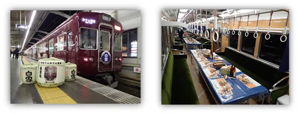 特別貸切列車(5100系)に乗って温かい「おでん」や地元食材を使った「特製能勢牛飯弁当」「いのしし汁」を味わいながら日本酒のミニ鏡割りを行い、楽しんでいただきます。