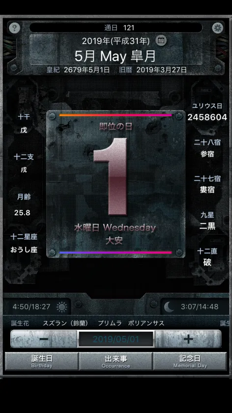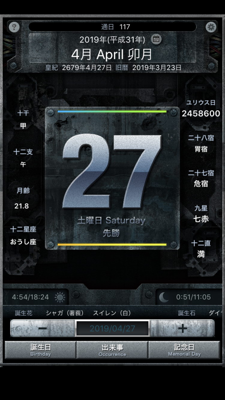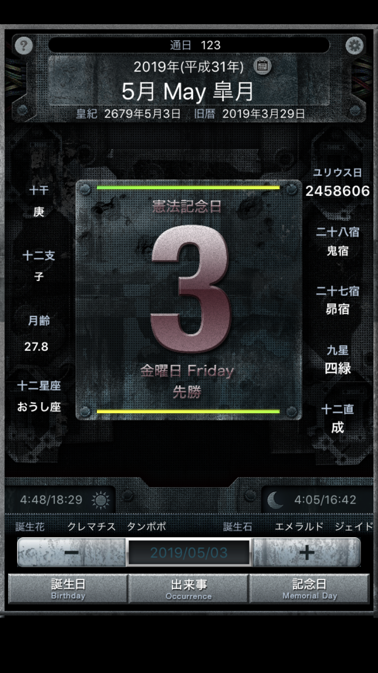 日めくりカレンダーの基本機能である、「その日に関する情報」も充実しています。通常の日付のほか、旧暦年月日、月齢、太陽や月の出入り時刻、六曜・九星・十二直・二十八宿などの暦注、その日が誕生日の有名人、過去の出来事、各種記念日の情報など、表示する日付に関する様々な情報を表示できます。
