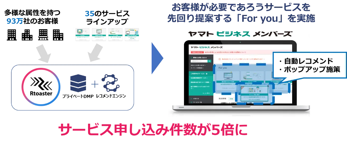 そこで、「Rtoaster」を活用し、お客様がヤマトビジネスメンバーズにログインすると、お客様の属性や利用履歴に応じて最適なサービスが表示され、お客様がより必要であろうサービスはポップアップでも提案されるようにしました。これらの施策により、サービス申込み件数が5倍となる大きな成果を実現しています。