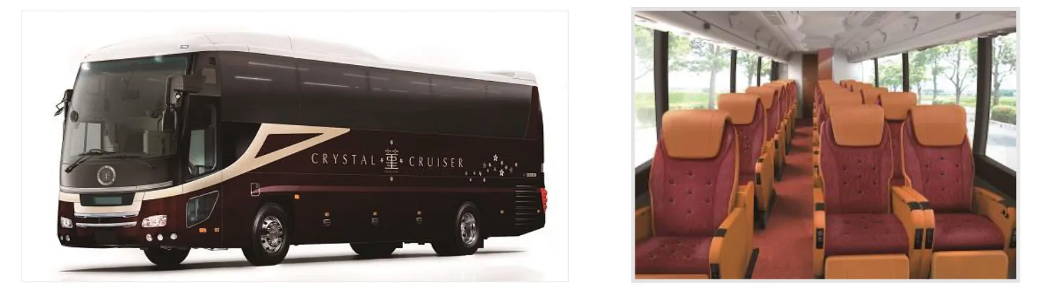ゆとりとまごころを大切にする“クリスタルハート”では、付加価値を追求する顧客のゆとりある旅への志向の高まりやニーズの多様化に応えるため、座席数を限定し、ゆとり・快適性を重視した当社専用の豪華バス“クリスタルクルーザー「菫」(すみれ)”を製造保有し、単なる移動手段だけではなく、“乗ること”を楽しむ専用商品を企画し、航空機や船、列車では訪れにくい、日本の魅力のふところ深く巡る旅を実現します。