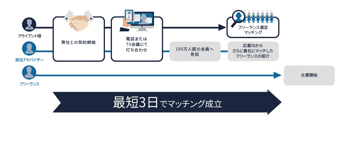 依頼内容にマッチした高スキル人材を専任アドバイザーが100万人超のランサーズ会員から厳選し、ご紹介します。信頼性を担保した、顔の見える、実績のある人材を、多様なニーズにあわせてスピーディにマッチング。即日の人材紹介、最短3営業日での稼働開始が可能となります。