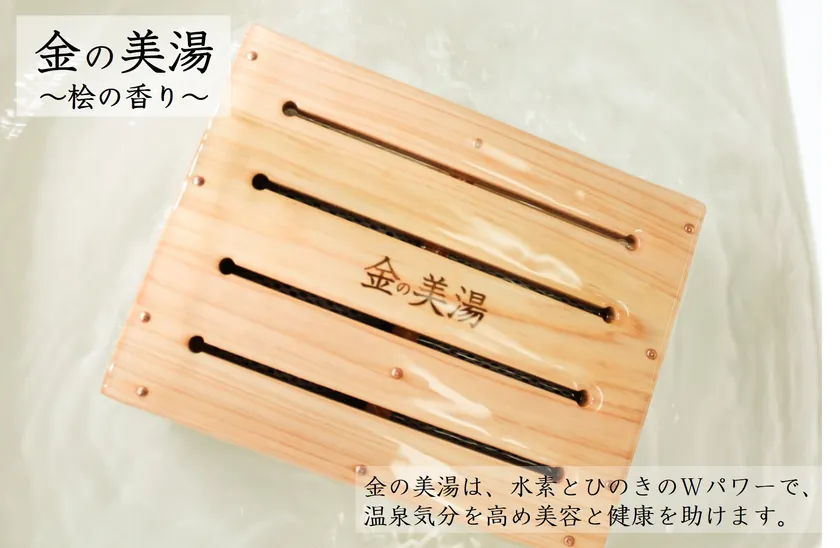 今回製品化された「金の美湯」は、金に美と書く「マグネシウム」の高純度品(99.95%)を使用し、金のように美しいお湯を目指して作りました。お風呂に入れることにより、マグネシウムと水が反応し水素が発生します。また、お湯が弱アルカリ性になり、温泉気分を楽しめます。専用ボックスは吉野産ひのきを職人が手作業で丁寧に仕上げ、良いひのきの香りがお風呂一杯にひろがります。