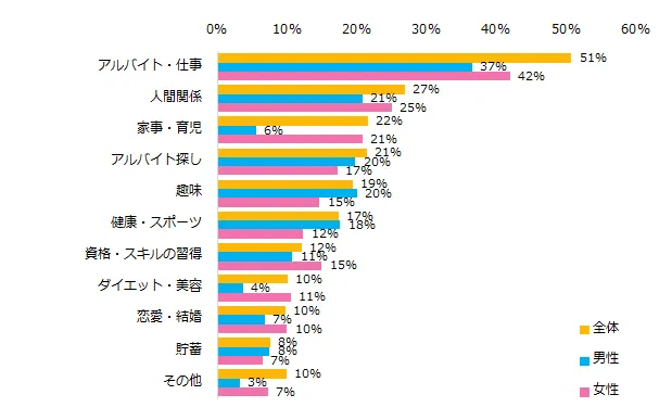 「2018年にがんばったことは何ですか?」と質問したところ、もっとも多かった回答は「アルバイト・仕事」(51%)でした。次いで「人間関係」(27%)、「家事・育児」(22%)と続きました。男女別にみると、男性は「趣味」(20%)、「健康・スポーツ」(18%)、女性は「家事・育児」(21%)が目立ちました。具体的なコメントもご紹介します。