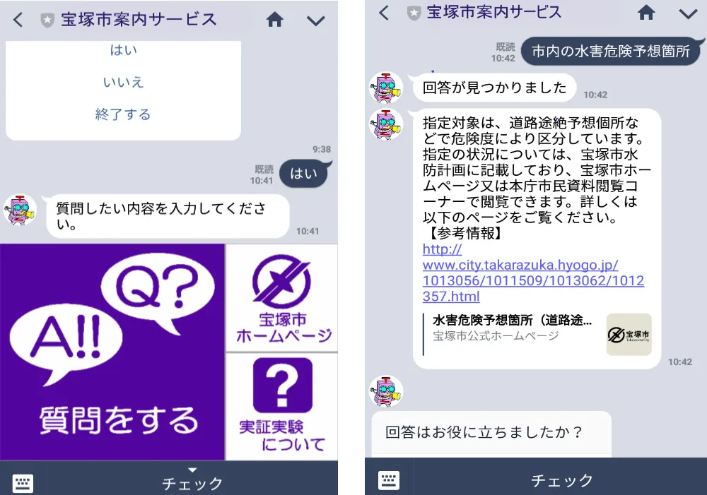 この実証実験は、2018年11月26日に宝塚市とアイテック阪急阪神が締結した、「AI(人工知能)を利用した自動応答サービスの実証実験に関する協定」に基づくものであり、無料通信アプリ「LINE」の専用アカウントに寄せらせた問合せに対して、チャットボットが自動で応答します。このサービスにより、市民のみなさまにとっては、休日・夜間など本庁の受付時間外でも、定型的な内容であれば自動応答によりすぐに情報が入手できるようになるほか、多くの方が使い慣れたツールであるLINEを利用することで、インターネット検索よりも簡単に問い合わせることができるようになります。更に、職員の問合せ対応業務の最適化・効率化も期待できます。