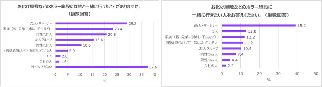 一方、お化け屋敷に一緒に行きたい人ランキングでは、こちらも圧倒的に「恋人・パートナー」(39.2%)が1位になる結果に。2位には意外にも「1人」(13.0%)がランクイン。実際には1人で入ることはないものの、更なるときめきを求めているのか、1人で入ってみたいと思っている人が多いことがわかりました。