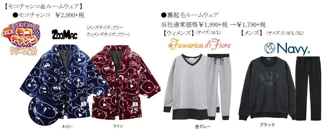 マックハウスのおすすめは、モコモコあったかい「モコチャンコ」です。ハンテンの良さをそのままに、温かくすべすべのフリース素材を使い、中綿をふんだんに詰めた温かルームウェアです。一緒に、裏起毛ルームウェアをセットでプレゼントしてみてはいかがでしょうか。寒い時期にほっこり心地よいアイテムです。