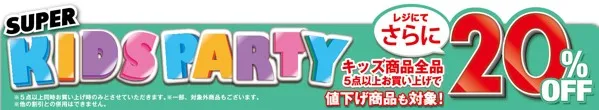 また期間中、キッズ商品まとめ買いのご提案をいたします。この時季は何かと出費がかかります。期間中、キッズ商品5点以上ご購入で、レジにてさらに20%OFFと、まとめて買うとよりお得なキャンペーンです。