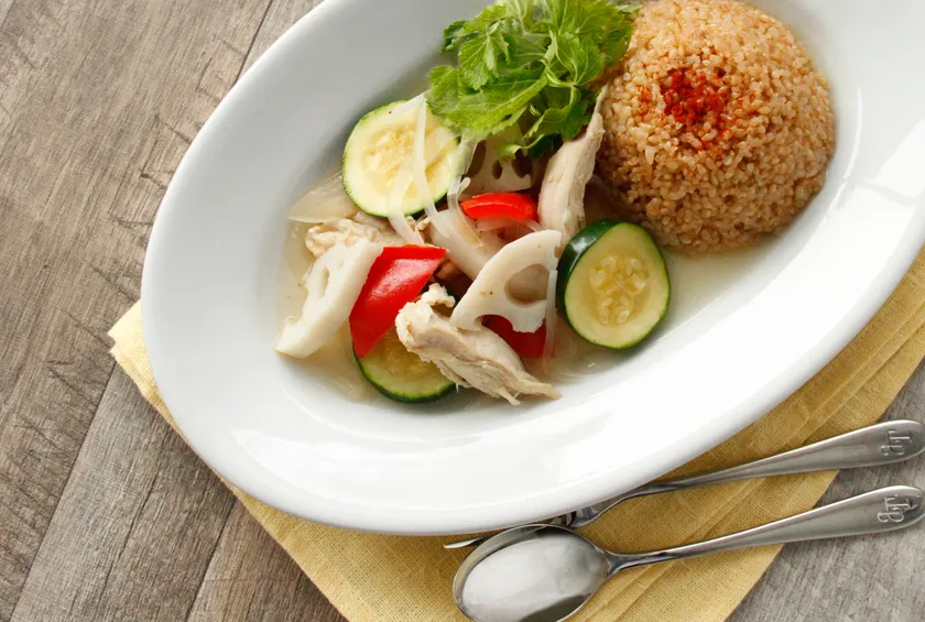 チキンとゴロゴロ野菜を酸味のある白ワインでコトコト煮込み、さっぱり・あっさりとした味に仕上げました。チキンに含まれるカルノシンにはAGEの生成を妨害して、分解・排泄されるようにする作用があると言われ、また蓮根は食物繊維が豊富で、糖の吸収が緩やかで太りにくいと言われています。具材を大きめにしているため、ヘルシーなのに食べ応え抜群です。また、ごはんには低GI食品である玄米を使っています。