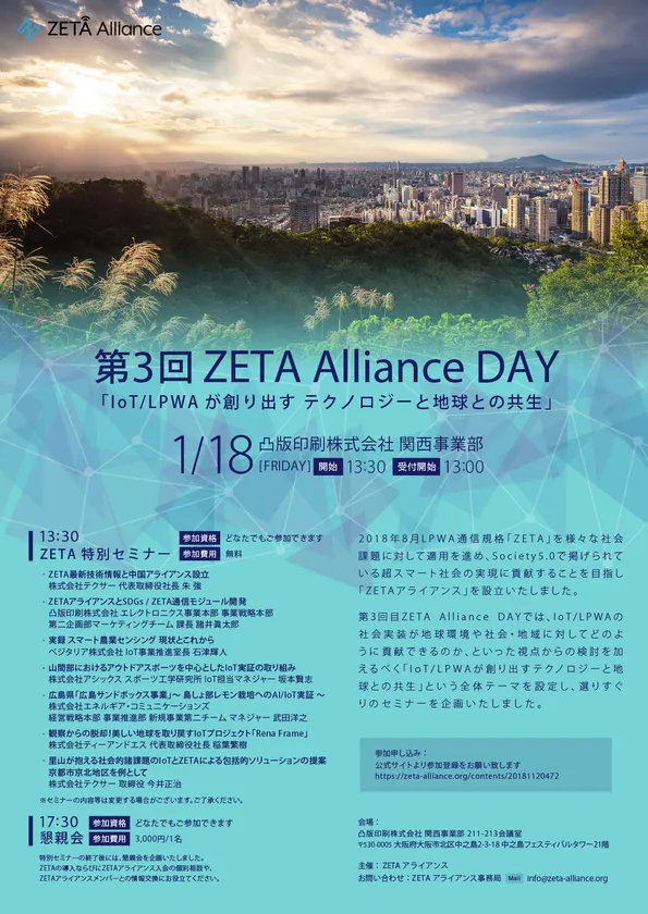 LPWA(Low-Power Wide-Area)通信規格ZETAを活用した超スマート社会の推進を目指すZETAアライアンスは、2019年1月18日に大阪市で「第3回 ZETA Alliance DAY」を開催いたします。
