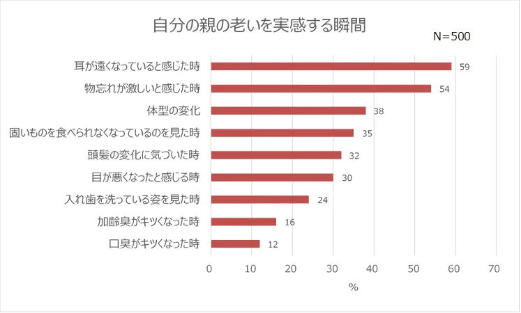 まず、自分の親の老いを実感する瞬間についてアンケートをとってみると、最も多かった回答は「耳が遠くなっていると感じたとき」(59%)でした。その他にも「体型の変化」(38%)、「固いものを食べられなくなっているのを見たとき」(35%)、「頭髪の変化に気づいたとき」(32%)など、身体的な衰えに関する回答が多く見られました。
