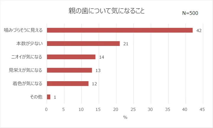 親のお口の健康について気になっていることがある人は6割以上という結果になりました。気になっている内容としては、「噛みづらそう」(42%)、「本数が少ない」(21%)、「ニオイが気になる」(14%)などの回答が見られました。