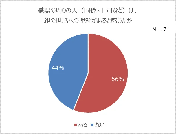 また、親の生活サポートと仕事に関して調査すると、「職場での理解がある」と答えた人は半数以上であることが明らかになりました。職場内で同じような状況の人が増えていることにより、自身が積極的に動くことで周囲の理解を得ることができるようです。