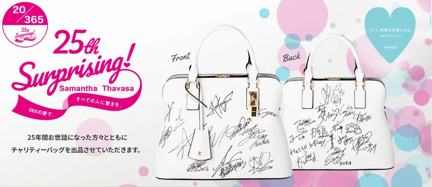 サマンサタバサ 25周年イヤー特別プロジェクト 25周年の感謝を込めて。「-365の夢を叶える。-」 No.20/365となるコラボ企画 サマンサファミリー26名の直筆サイン入りバッグを Yahoo! JAPANが実施するチャリティーオークションに出品!