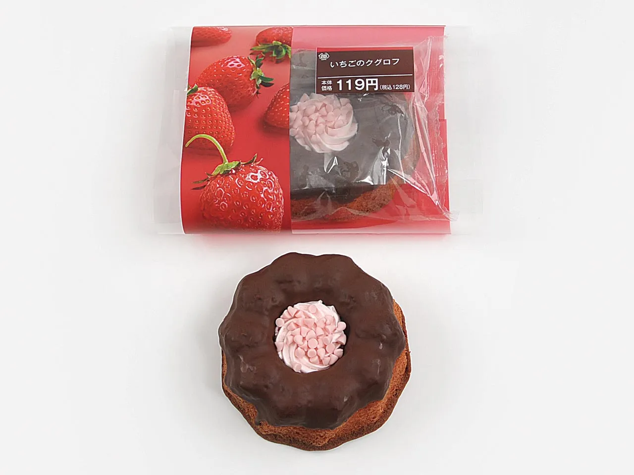 いちご風味に仕上げたしっとり食感のスポンジを、クグロフ型で焼き上げ、上面をチョコでコーティングしました。真ん中にいちごクリームを絞り、いちごチョコチップでトッピングした菓子パンです。