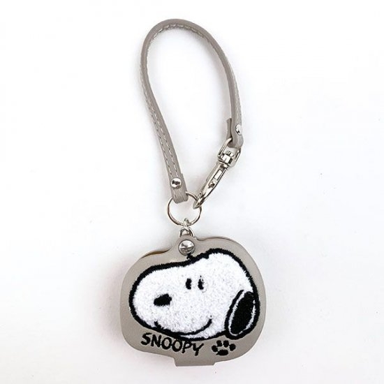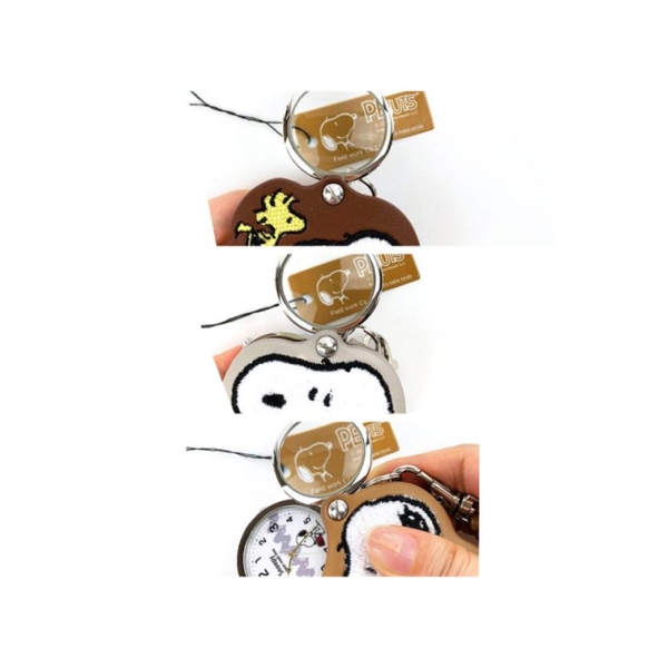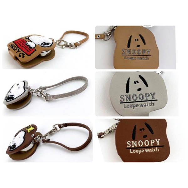 全種類にルーペ・懐中時計・ストラップがついているのでバックにつけたり、キーホルダーとして身につけることもできます。モコモコスヌーピーの反対側のイラストと色味に合わせた文字入りです♫正面がかわいらしいデザインなので、あえてシックなのもポイントです。