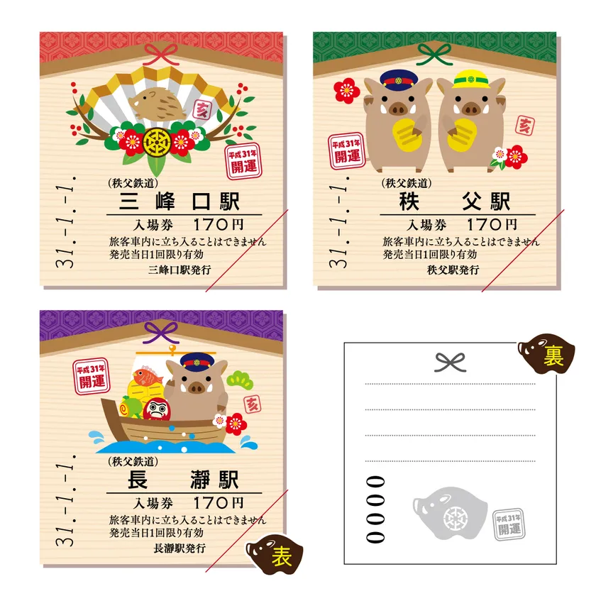 2019年干支の『亥』をモチーフにした、カラー硬券入場券です。硬券の裏面には、お願い事が書けるようになっています。また、台紙は絵馬型になっており、表面には急行開運号のイラストがデザインされ、裏面には秩父三社のご紹介をしています。