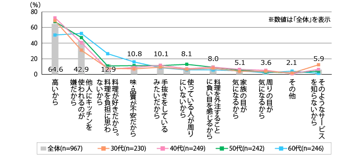 次に、家事代行を利用しない理由について聞いたところ、30~50代では「高いから」が1位になりました(図3)。60代は「他人にキッチンを使われるのが嫌だから(52.4%)」が1位、「高いから(50.4%)」は2位となっています。「他人にキッチンを使われるのが嫌だから」という理由に着目してみると、この理由を選択した年代は60代が最も高く(52.4%)、30代が最も低く(30.9%)になりました。