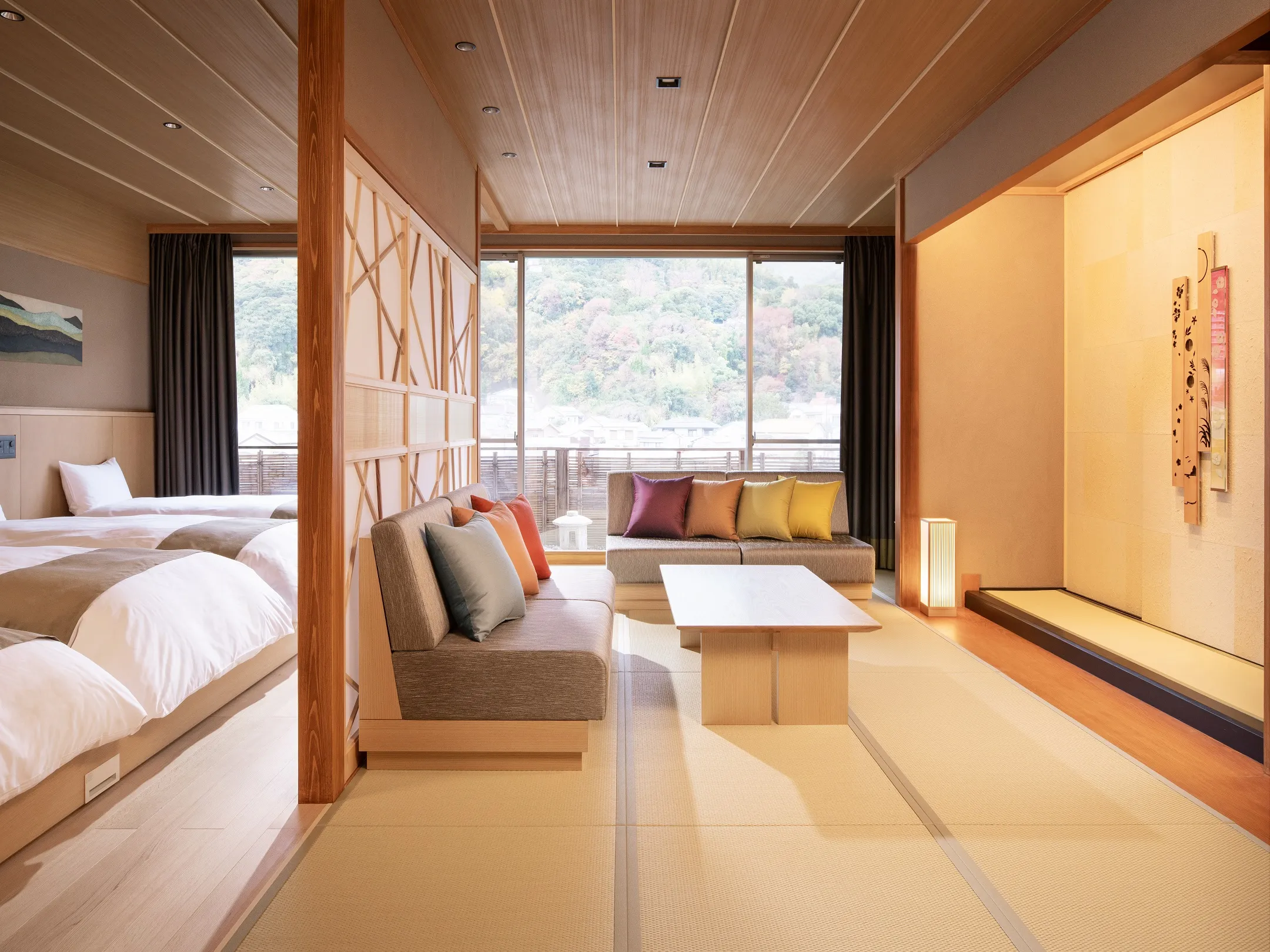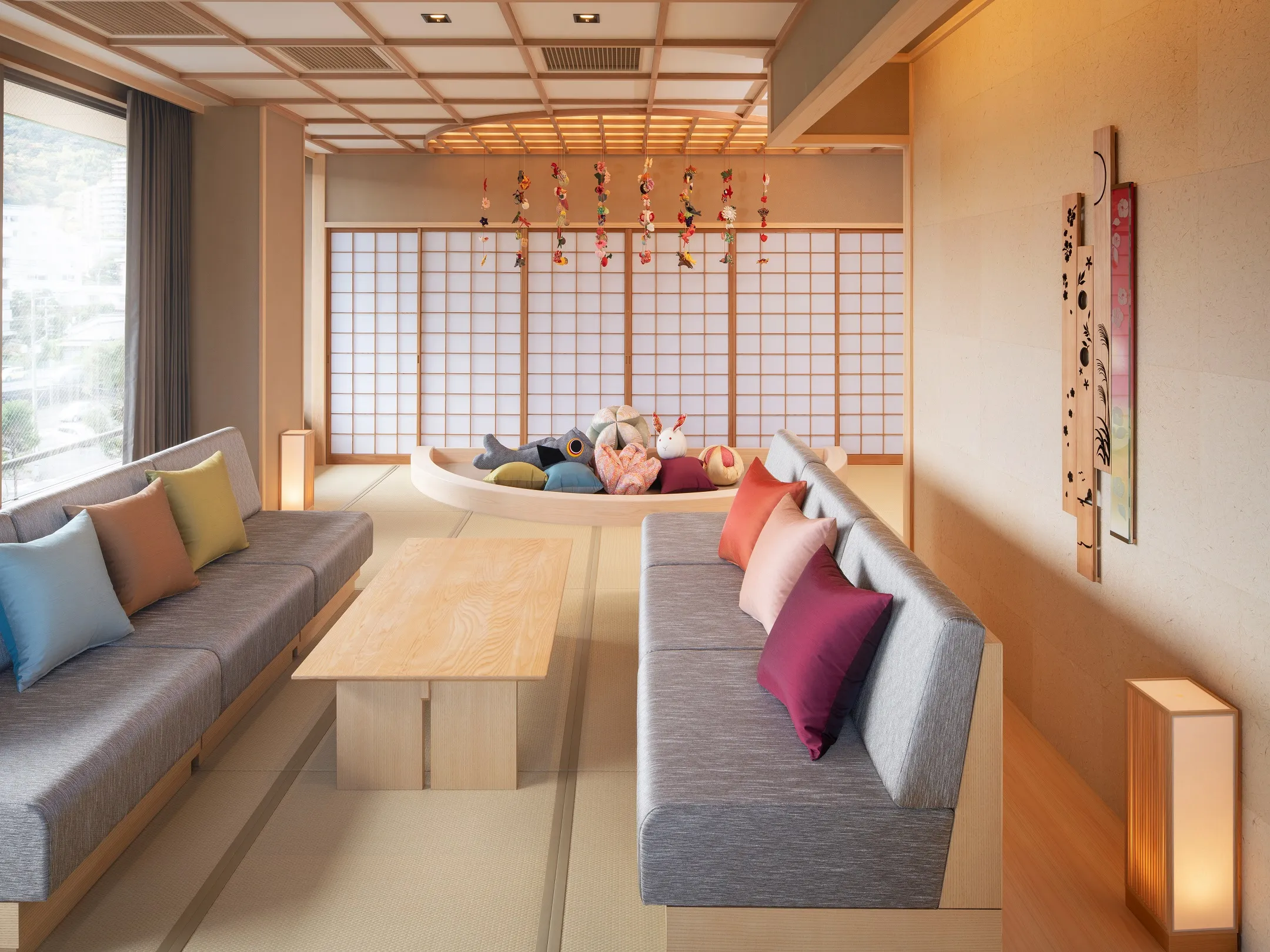 星野リゾートで初めて家族、特に三世代家族の宿泊にお勧めの8名定員の客室が誕生しました。客室中央には家族全員でゆったりと寛げるリビングルームと、2つのベッドルームを備えています。リビングルームには、伊東の伝統工芸「つるし飾り」と、つるし飾りをモチーフにした巨大なクッションを配し、子供達が遊べる空間を作りました。また、四季を表現した「花暦スクリーン」や「木漏れ日行灯」を施し、室内でも花暦を感じられます。子供のお食い初めや入学祝い、祖父母のお祝い(還暦・古稀など)など、三世代家族の旅行にお勧めの客室です。