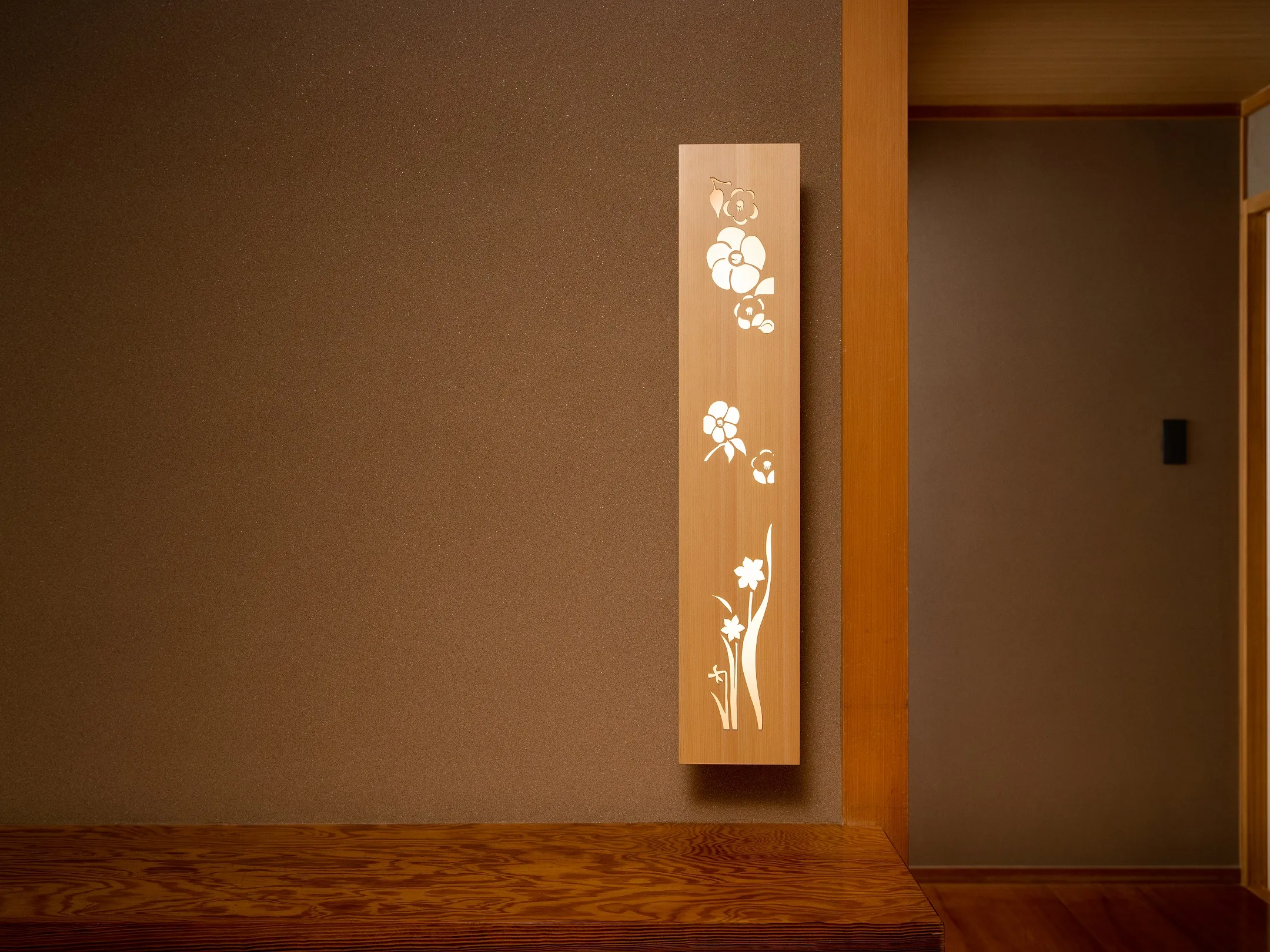 客室に入ると、その季節のはじまりを表現した、草花をモチーフにしたデザインの行灯が、あたたかい光を放ちます。このモチーフは、伊豆修善寺在住の切り絵作家、水口千令(みずぐち ちはる)氏が手がけたもので、冬:寒椿・すいせん/春:桜など身近にある草木を切り絵のデザインとして描かれたものです。季節毎にその季節に合ったモチーフに変わります。