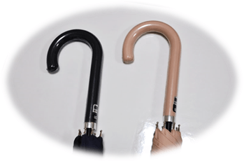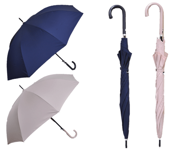 今年の新商品として、婦人用折り畳み傘にピンク、長傘にピンク・紺が登場いたしました。長傘の持ち手には生地と同一カラーの合皮を使用し、かわいらしいデザインに仕上げました。