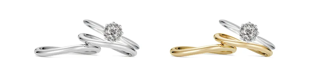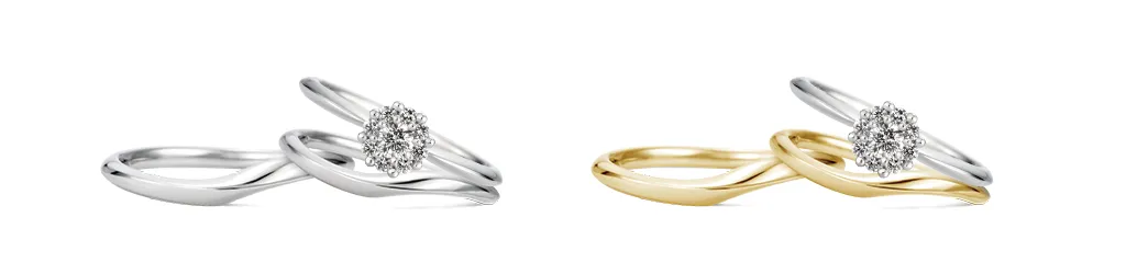 画像右 婚約指輪:ハピネスクラウン3(プラチナ950)、結婚指輪:コメット2(K18イエローゴールド) 240,000円