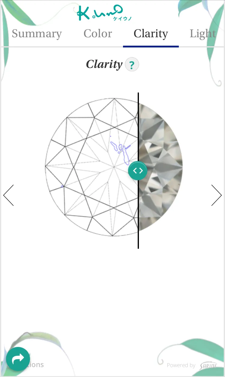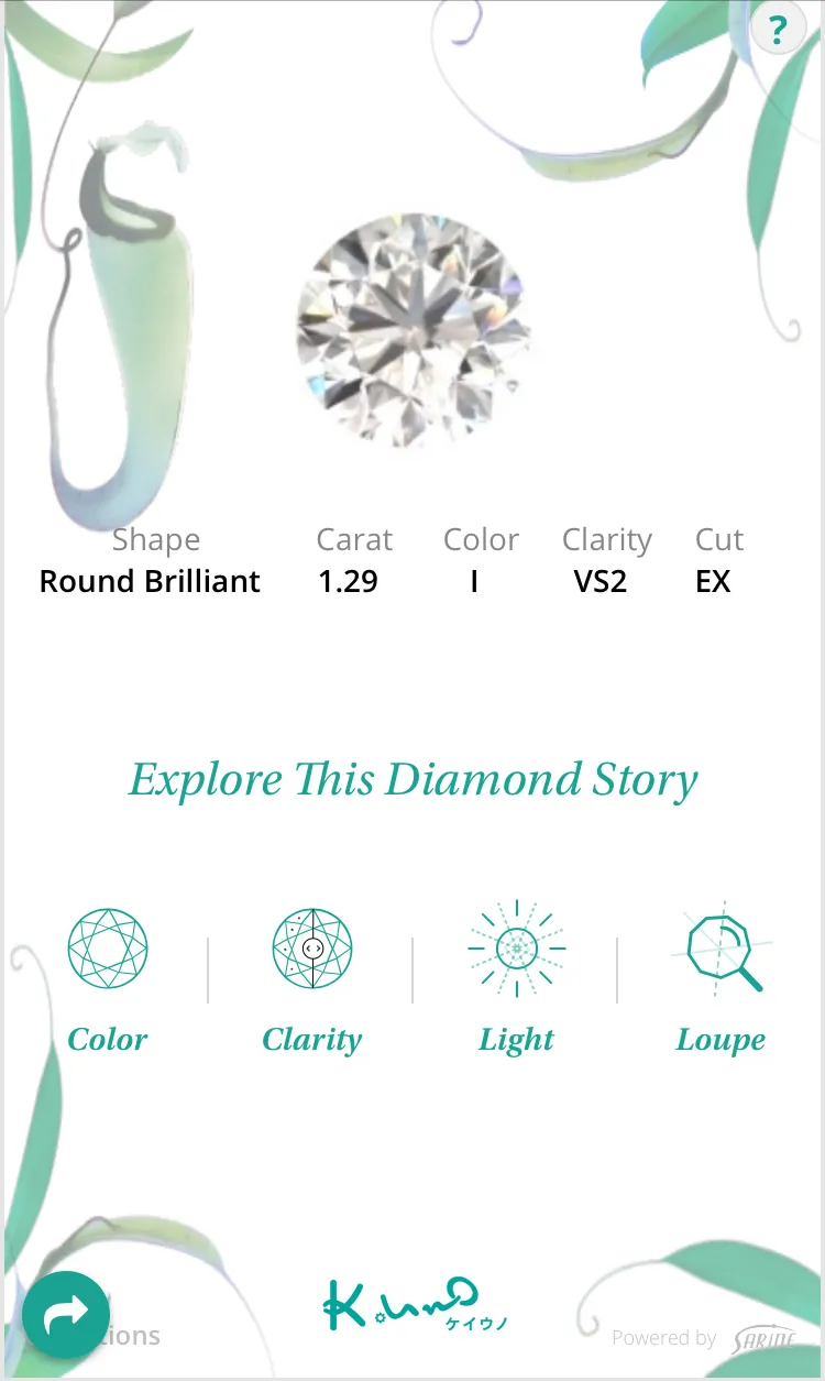 ケイ・ウノは、ダイヤモンドの“輝き”を測定・分析するデジタル鑑定書「Sarine Profile(サリネプロファイル)」を2017年4月に日本初導入しました。スマートフォンや電子タブレットなどインターネット上で3Dルーペ機能により360度回転して見ることができるなど、「4C」以外の価値として“輝き”を9段階に数値化して閲覧することができます。